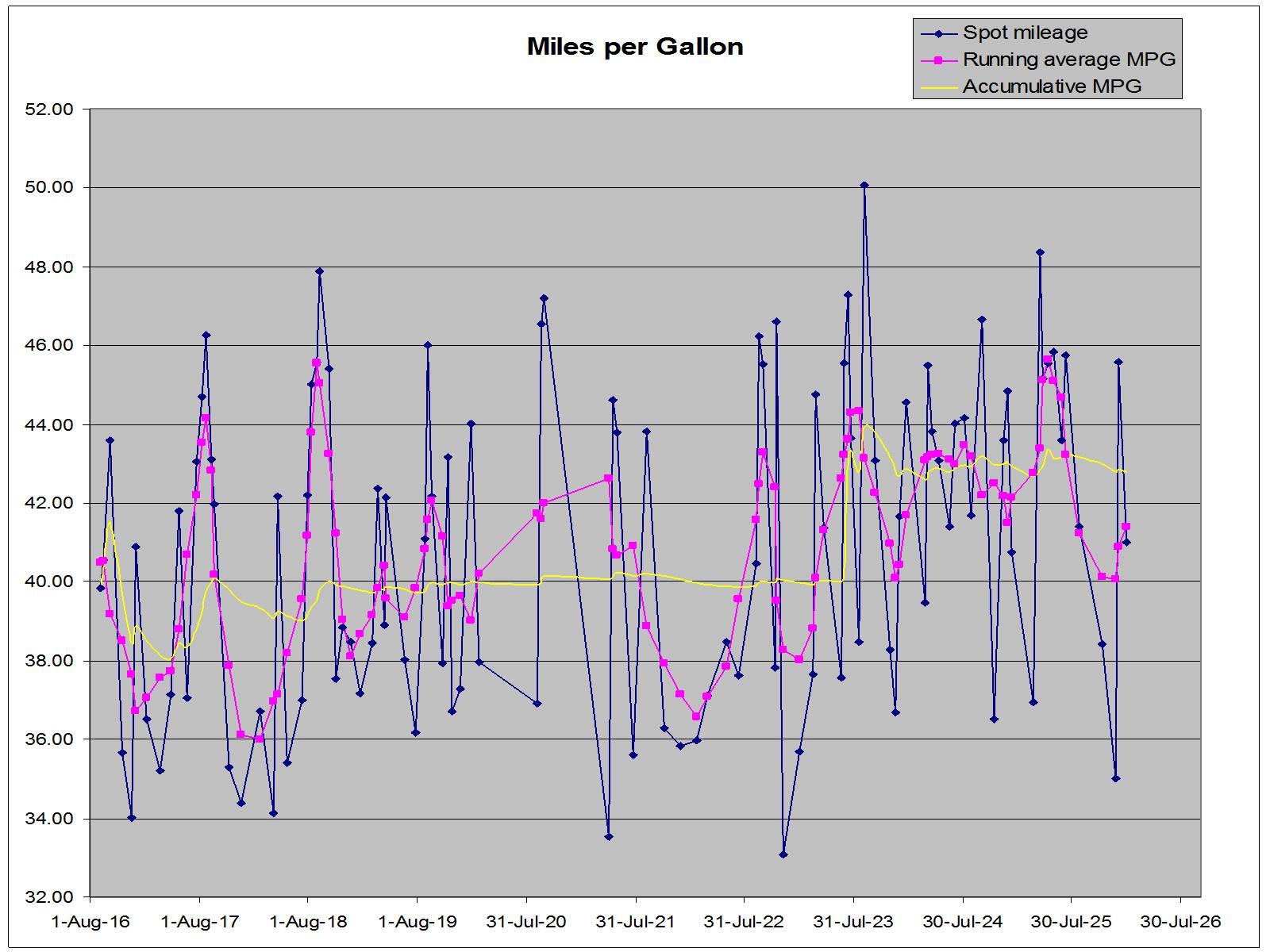 This graph shows how one simple change can have a beneficial effect on MPG. The yellow line is the relevant one, the step showing where I reset the accumulator.