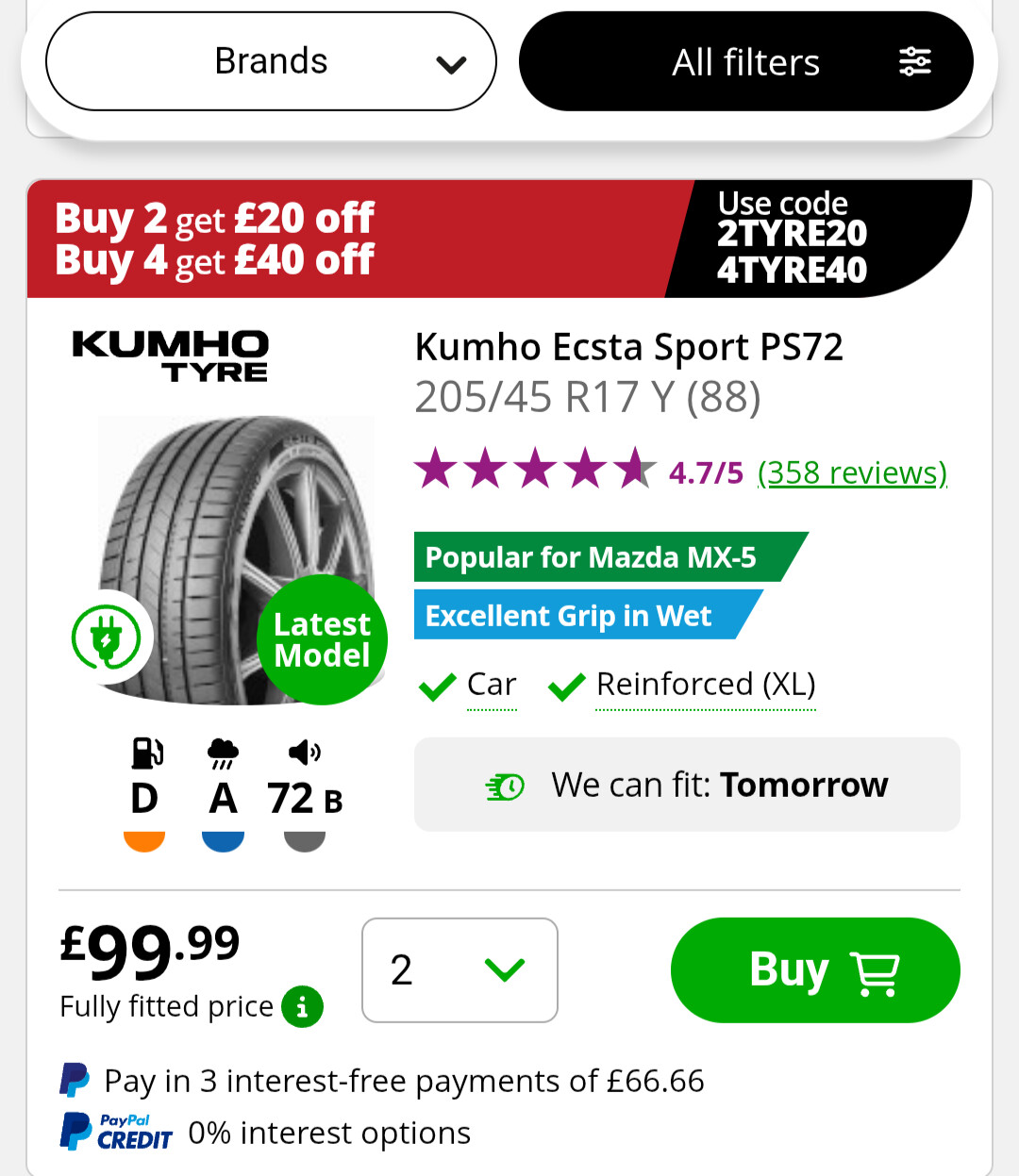 Hit the coupon code in and it brings the price down to £90 per tyre fully fitted. Or check out your local tyre fitters, do a price match as I did it. It can at times be favourable to give your local place/garage a shot at supply and fit price wise.