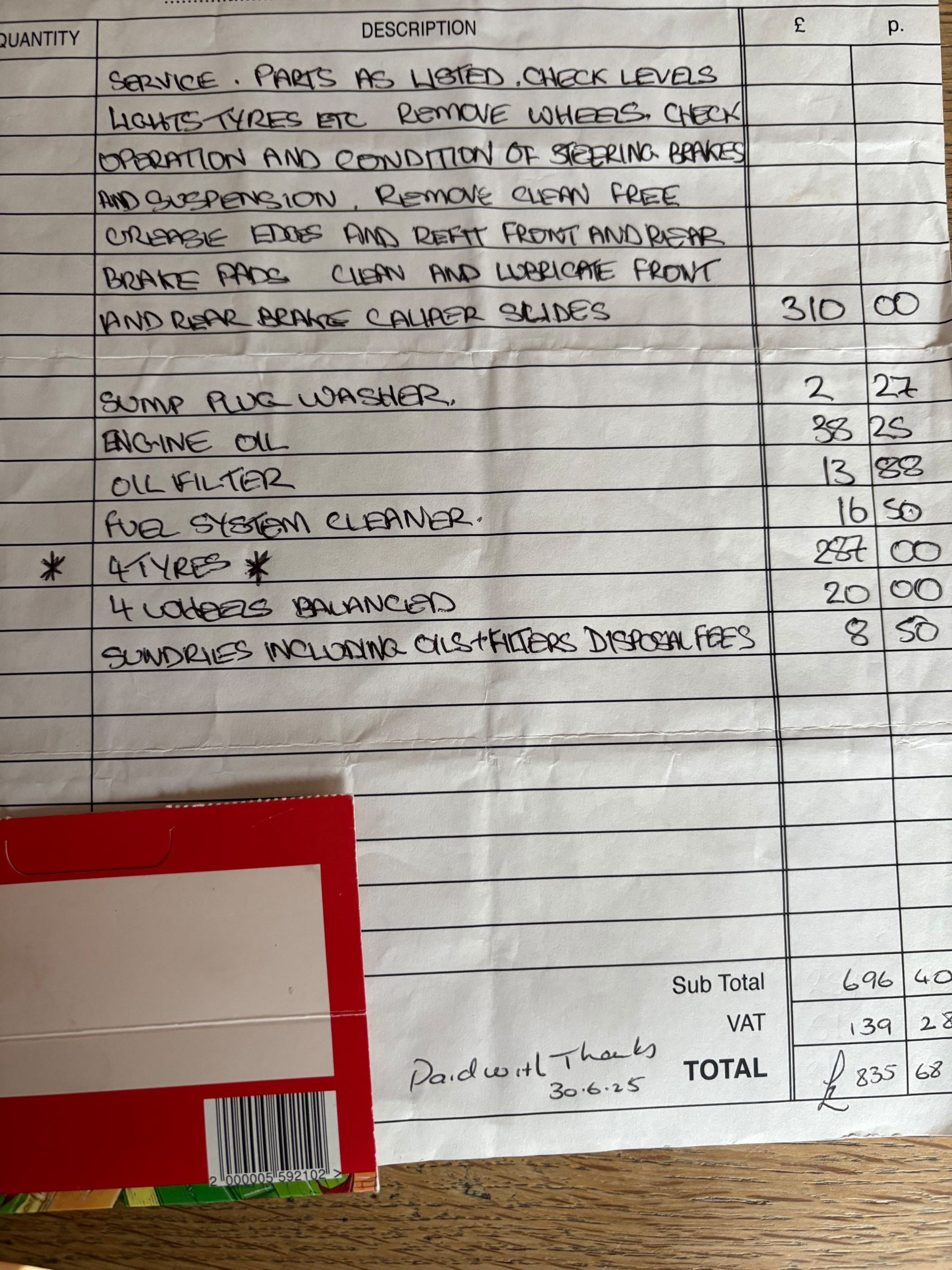 The mileage of the car is about 24k. About the brakes, they mentioned that they are “corroded”. It seems reasonable to me since the car sleeps outside in Scotland. I’m fine with the change, the tires too. I was just wondering if they were trying to charge too much.