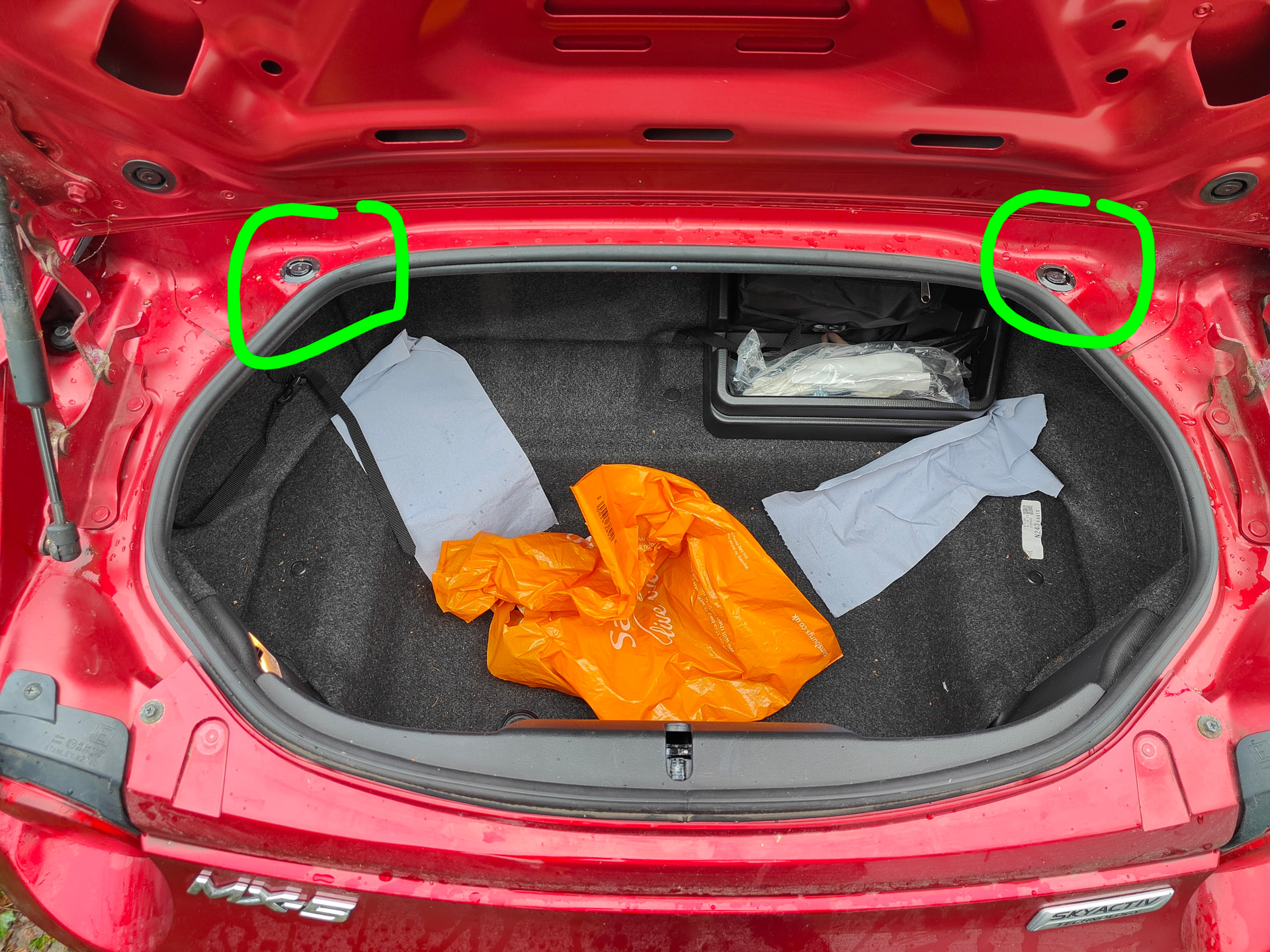 In fact, EVERY time it’s been raining, either the next day, or the same day, when the weather allows, I open the boot and check those to see if they are filled with water. I find with the half cover(s) on, they are only about 20% of the time. MOst of the time I slightly lift the boot lid (not too high as boot water slides down the boot into the area), and have a peak and they’re usually they are dry and fine. If they do have water in them, I get a bit of kitchen towel and do a contortion job and ‘suck’ it up via capillary rise of the kitchen towel. Leaving those full of water for ages is asking for it imo. Probably the most annoying thing of the ND imo.