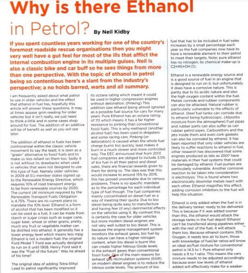 If you look back to previous threads on this subject you will see that E5 is corrosive, let alone E10. In my Mk3 I always use Shell super as I don’t do that many miles. In my day to day car I fill up with super unleaded every fourth tank. I’m also looking around for additives, but the introduction of E10 is just political and, because cars won’t last as long, it’s not as green as they would have you believe.
