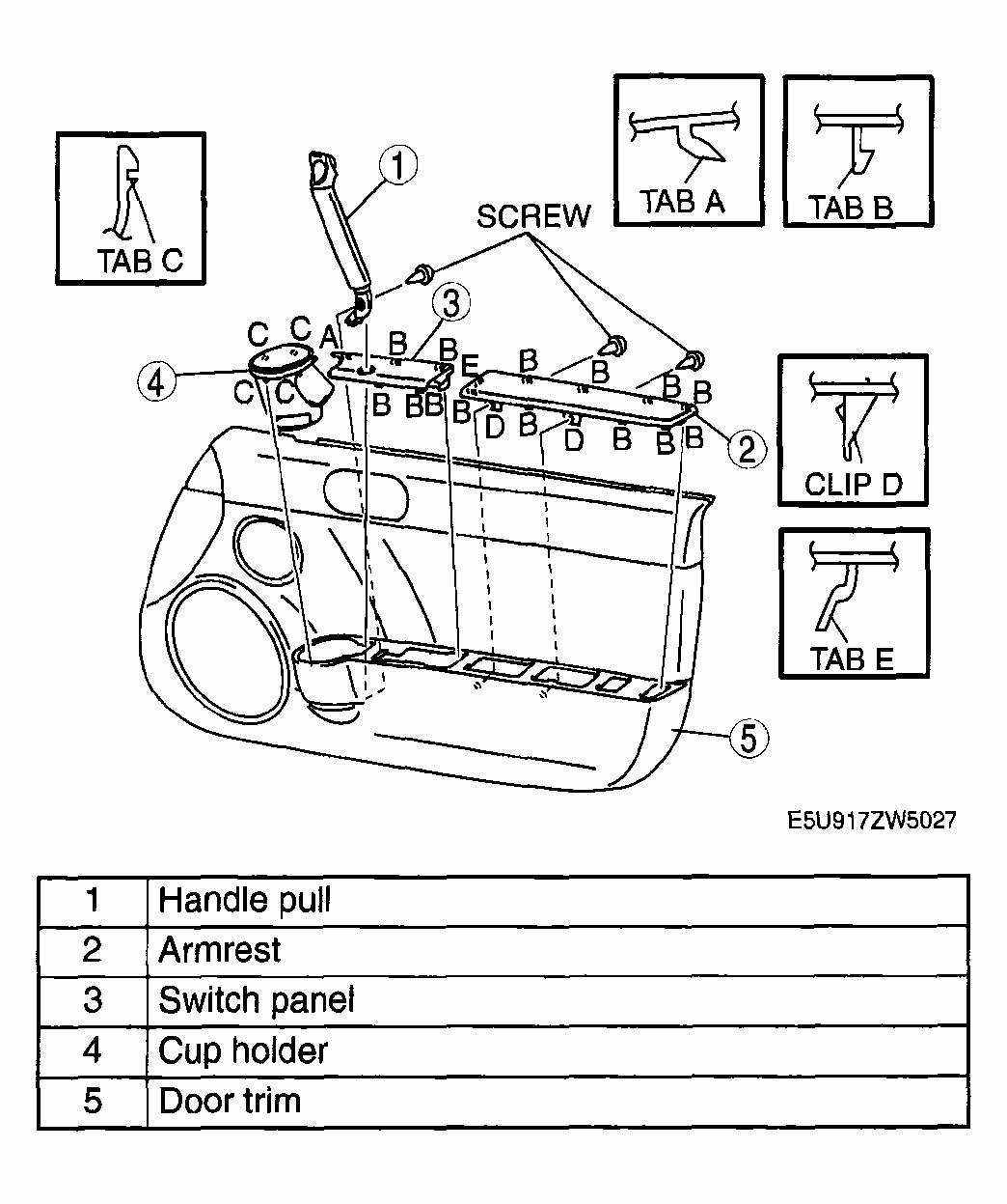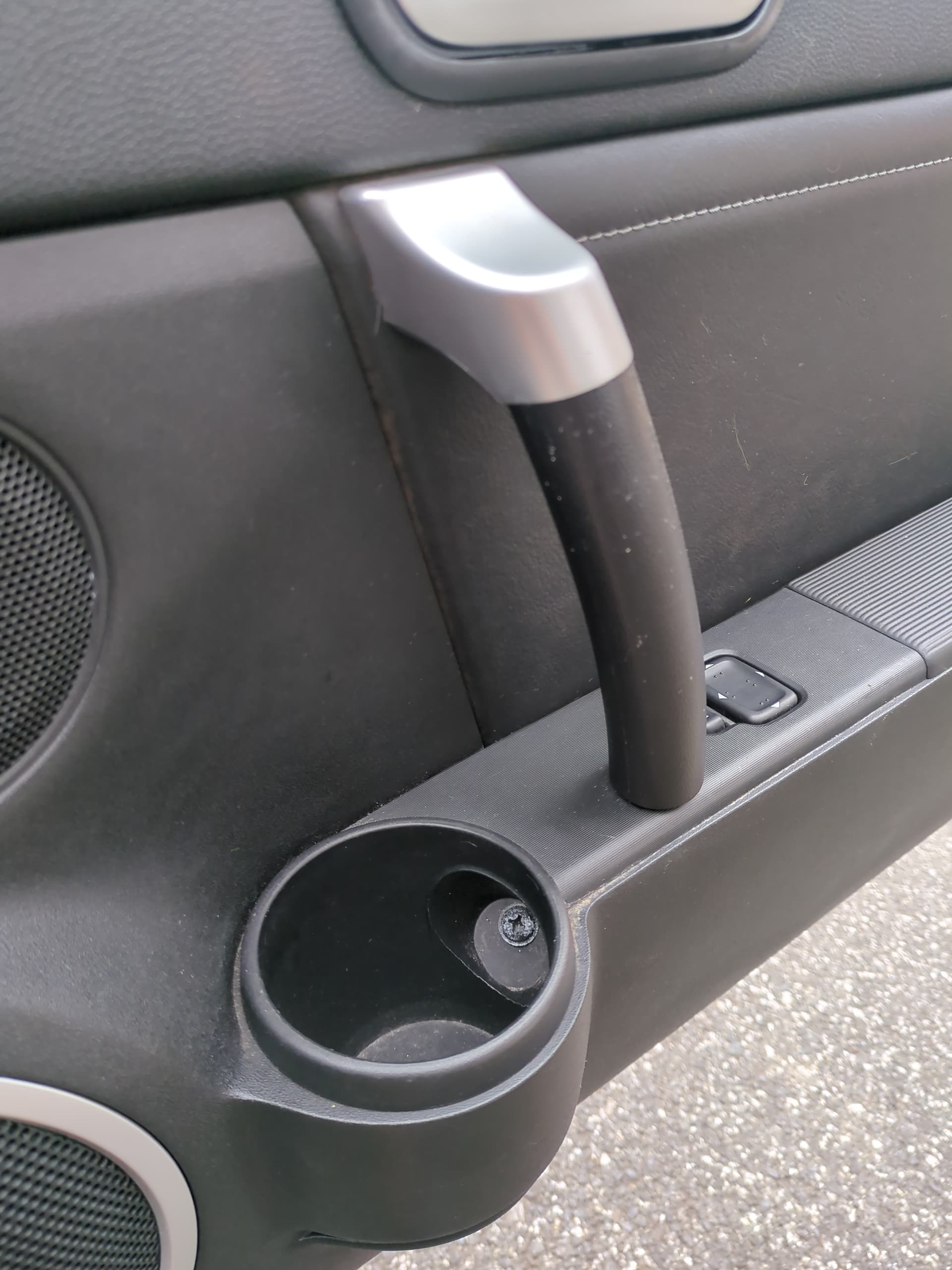 Prise the silver cap off to reveal a screw. You can see a screw in the cup holder too. There’s a third screw under the plastic cover plate behind the door release handle/lever, the plate just prises off. Once the screws are removed you can get you fingers or a trim removal tool under the bottom of the door card and pull it towards you. This should release the door card from the door frame eventually when it’s free of all the clips around the door. The top of the door card hooks over the top of the door.