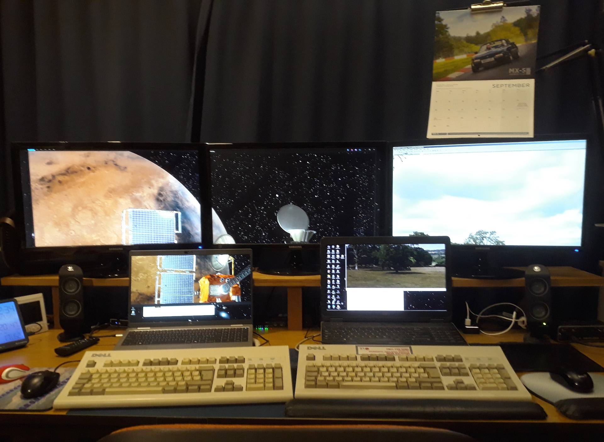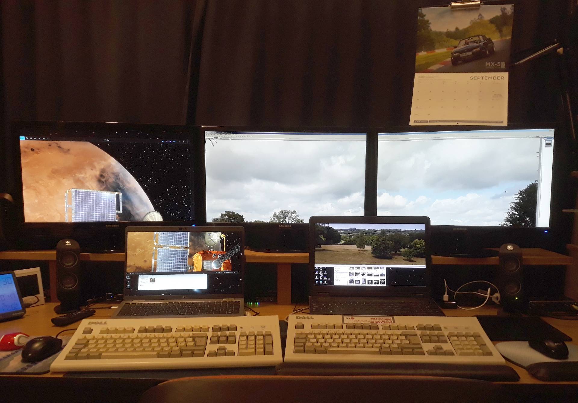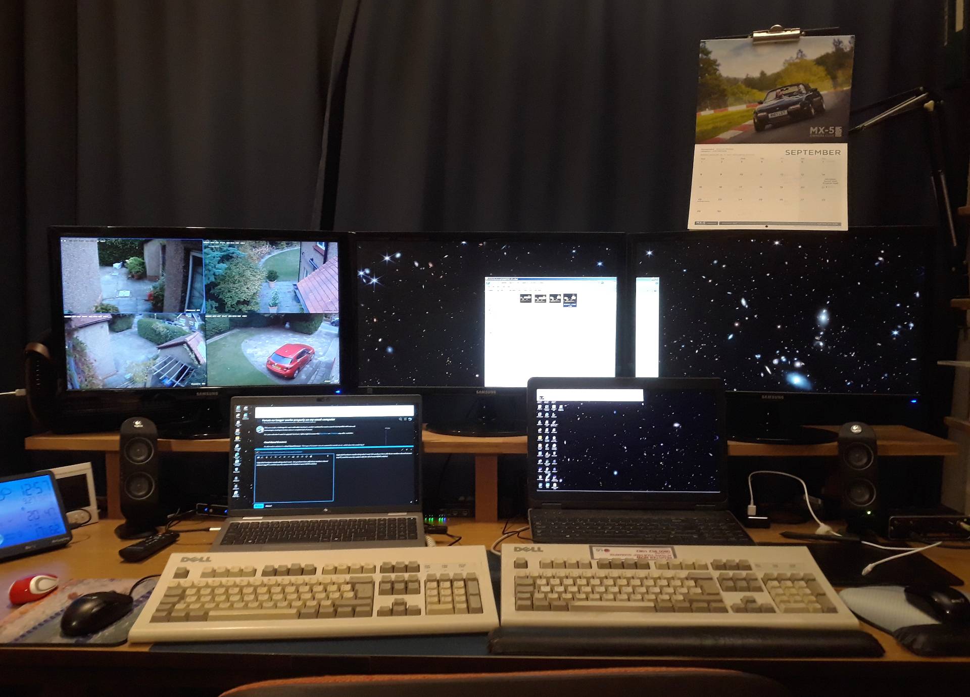 Upgraded hardware mostly doing what I want. Set up shown here with three monitors shared between two PCs and the security system with the aid of some HDMI switches.