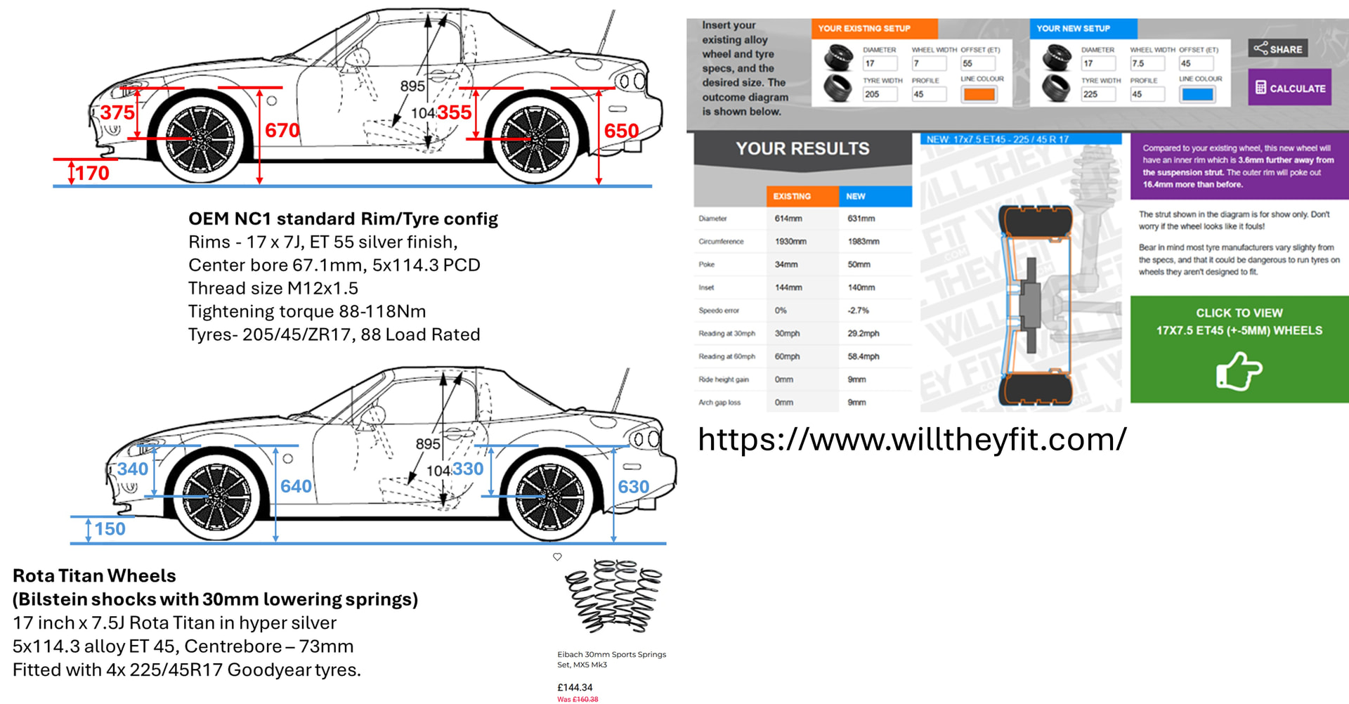 I know there are often a lot of queries about lowering springs and wheel sizes so thought I would share pics and info from my recent changes to our NC1. Yes, it’s the same car, now with a black roof and a taken on a slightly cloudier day!