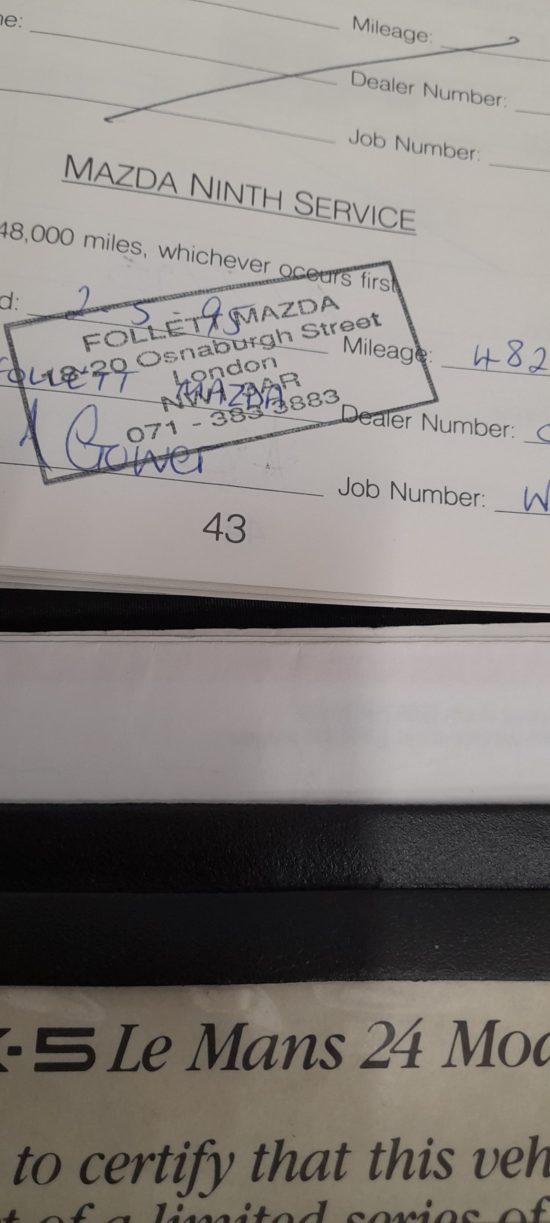 Number plate ended up in the ‘mouth’. Car also came with early ‘MX5OC/Miata Club of America - UK Chapter’ club membership sticker, which was retained. The early and original screen sticker from the Mazda Le Mans dealership at Arnage was sourced from French eBay and just seemed appropriate, as does the change of registration. The dealership still exists.