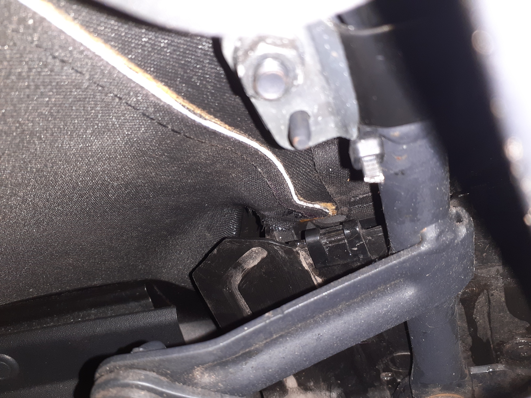 The upright panel I refered to in my text is shown in the middle of the photo with a hockey stick mark on it. This is a shot after I had pushed the hood bit back behind the upright. As you can see the hood looks to have a slit or tear in it which may be why it pushed over the upright.On further investigation both sides have the ‘cut’ in the hood so this appears to be standard.