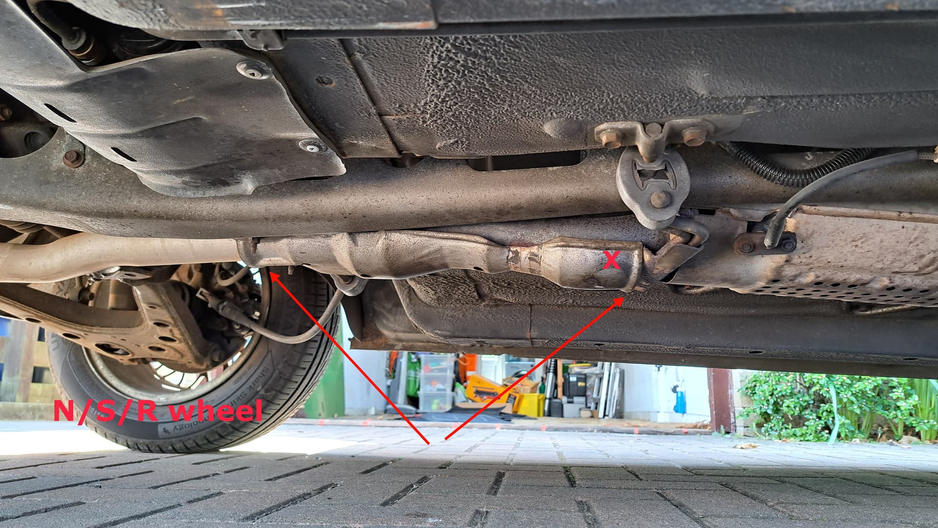 Hi folks, looking for a wee bit of advice on my 1993 Mk1 Eunos S Special. I had a rattle from underneath which sounded like a loose exhaust baffle, however upon jacking the car up I can see that it is the metal plate under the central section of the exhaust which is causing the rattle – see photo, it’s the part between the 2 arrowheads, and the rattle is coming from the front of it (x marks the spot!). Looks like a heat shield however it’s UNDER the exhaust so isn’t really shielding anything from the heat apart from the road surface! Can anyone tell me its purpose, and can I just remove it?