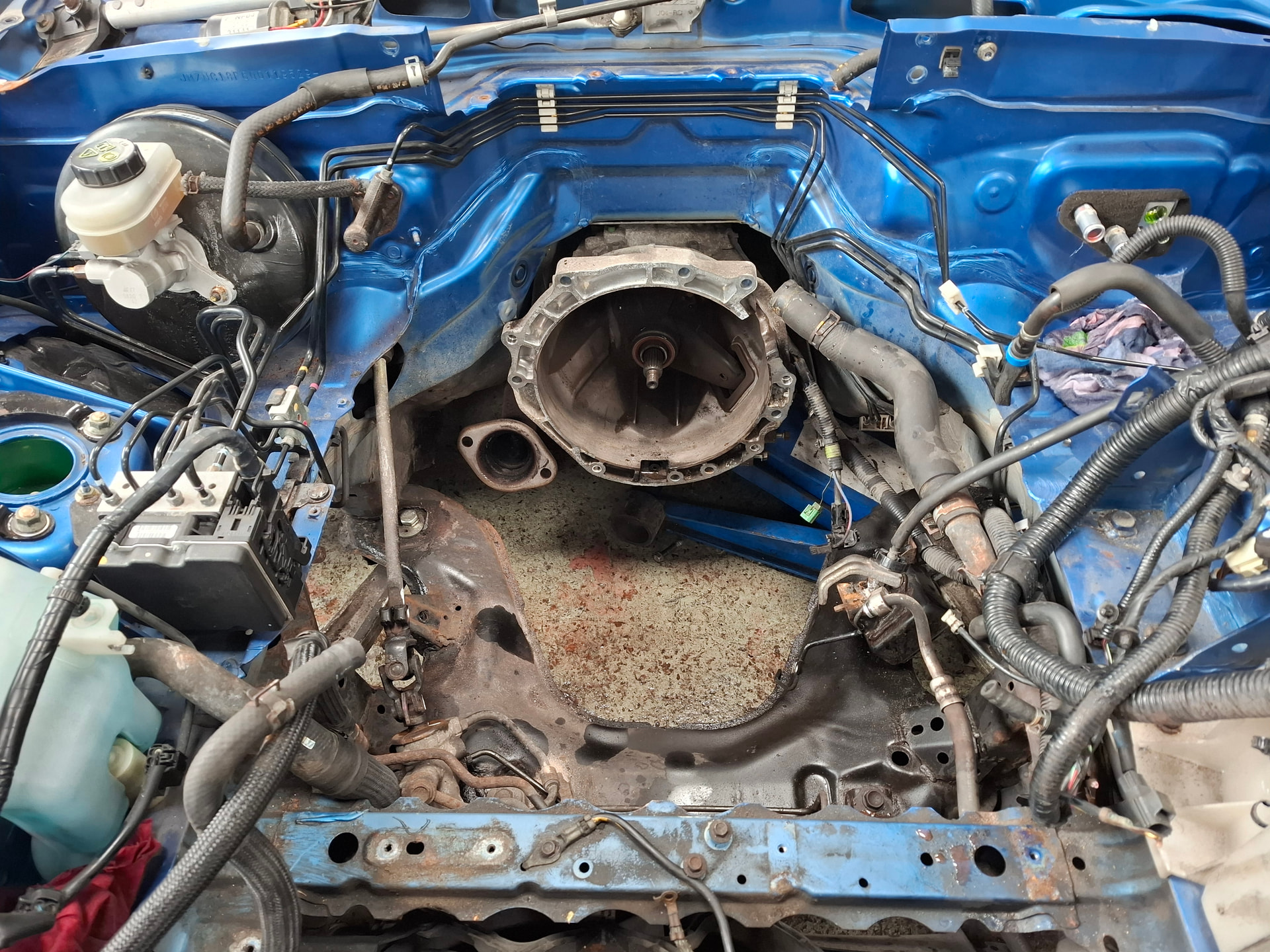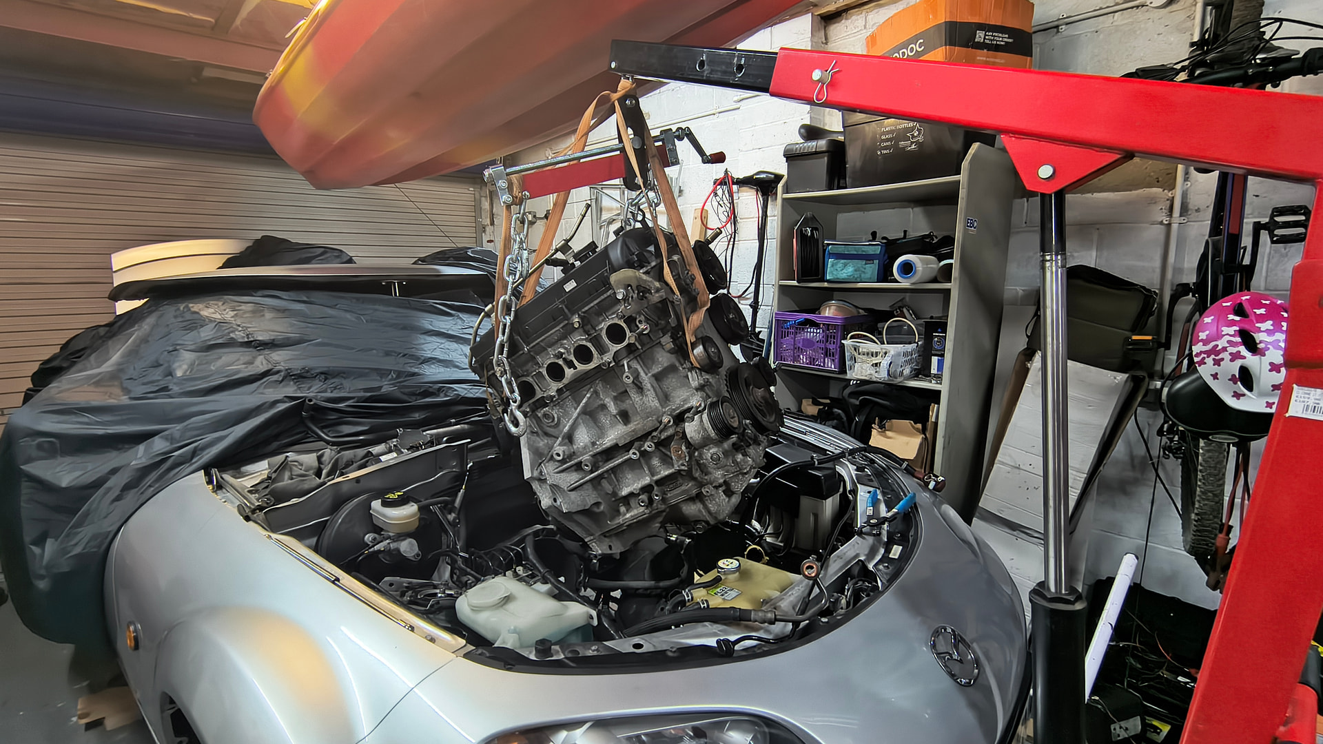 I tried to take out the engine bay as little as possible. 8 left the ECU, fuse box, coolant tank all that jazz. Once the coolant pipes are out the way you can tilt that engine and it’s out.