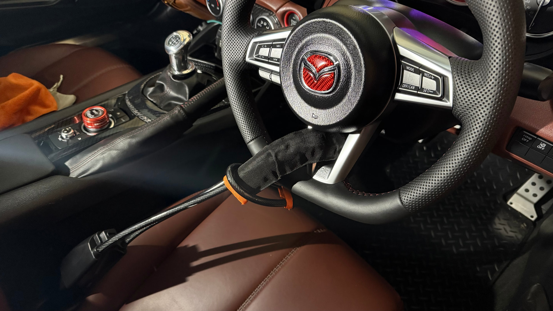 loop cable through the steering wheel then click into the seat belt buckle