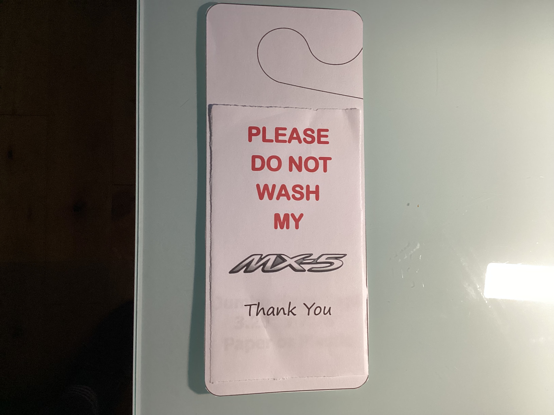 After reading the thread on Dealer Feedback and in particular the comments about not wanting the dealership to wash cars (myself included) I had a thought. I always ask the service desk to write “No Wash” on the job sheet but I am concerned that this message doesn’t always reach the people involved. I didn’t particularly want a hastily scribbled note to leave inside the car either as it could easily be ignored or thrown away. So I have ordered some acrylic hangers to put on the rear view mirror, printed on both sides so it can be seen from outside and inside the car. Here is a mock-up: