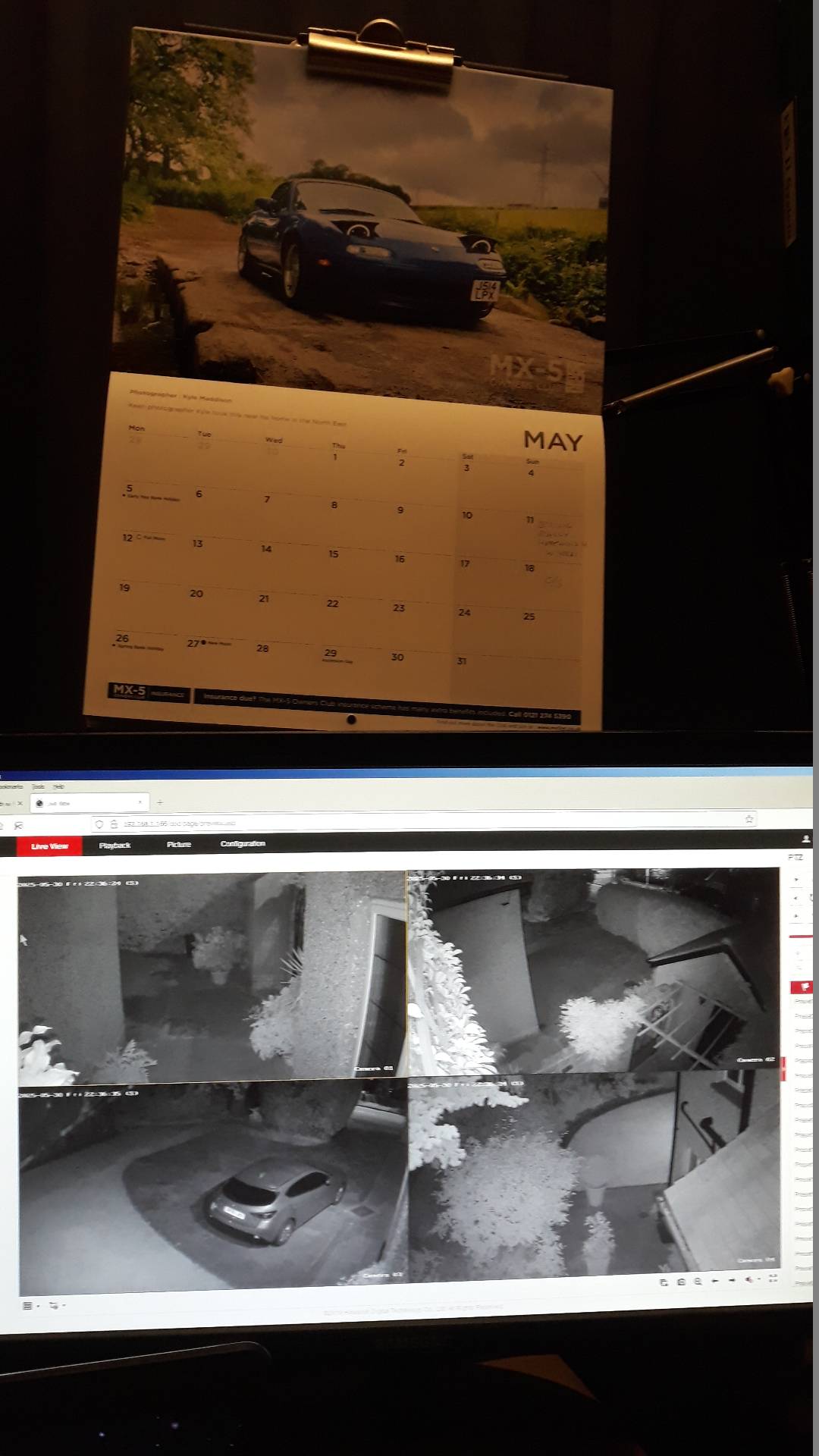 Here’s a lower res phone photo of local network showing nighttime views taken a few minutes ago gathered on a PC screen. The TV’s in bedroom and downstairs also can watch this HD output. Useful to see who’s calling