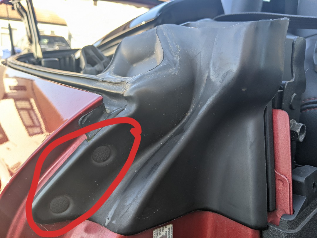 And finally refit the end parts by pushing those 2 rubber plugs back into the car body and the white clip on the inside too. Apply some pressure to where the black silicone was applied, to help it spread and stick properly, then get some paper tissue and stuff it between the end parts and the door, to keep pressure on there until the silicone dries up.
