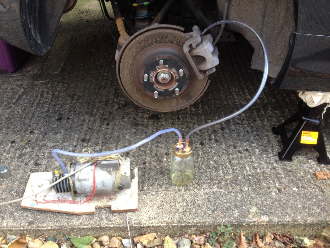 Just a quick update. I found that old vacuum pump I was talking about, and with a bit of tubing I found in the garage and an old Branston Pickle jar ( other jars are available ) I knocked up the below bit of kit. Works a treat. Turned pump on and controlled the flow with the bleed nipple. So easy. Thanks again for the replies, these sowed the seed to use a vacuum to pull the fluid through. These forums are great. D