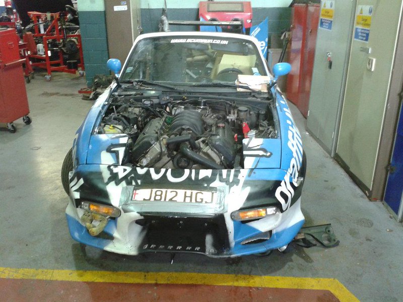 The AJV6 had a lot of commonality with the Ford Duratec V6. In face it was Ford who did the first conversion, as an apprentice project, dropping the V6 from the Lincoln LS (a rebodied Jag, or was the Jag a rebodied Ford). Ford fitted a RX7 diff and RX7 gearbox, presuma bly because it was a bit stronger than the MX-5 item. They used an airbox out of a Ford Taurus, and the power steering pump came off the LS, but it had to be reworked for the Mazda steering rack. RX7 brakes, half shafts and suspension uprights. There was never any plan to put such a car into production.