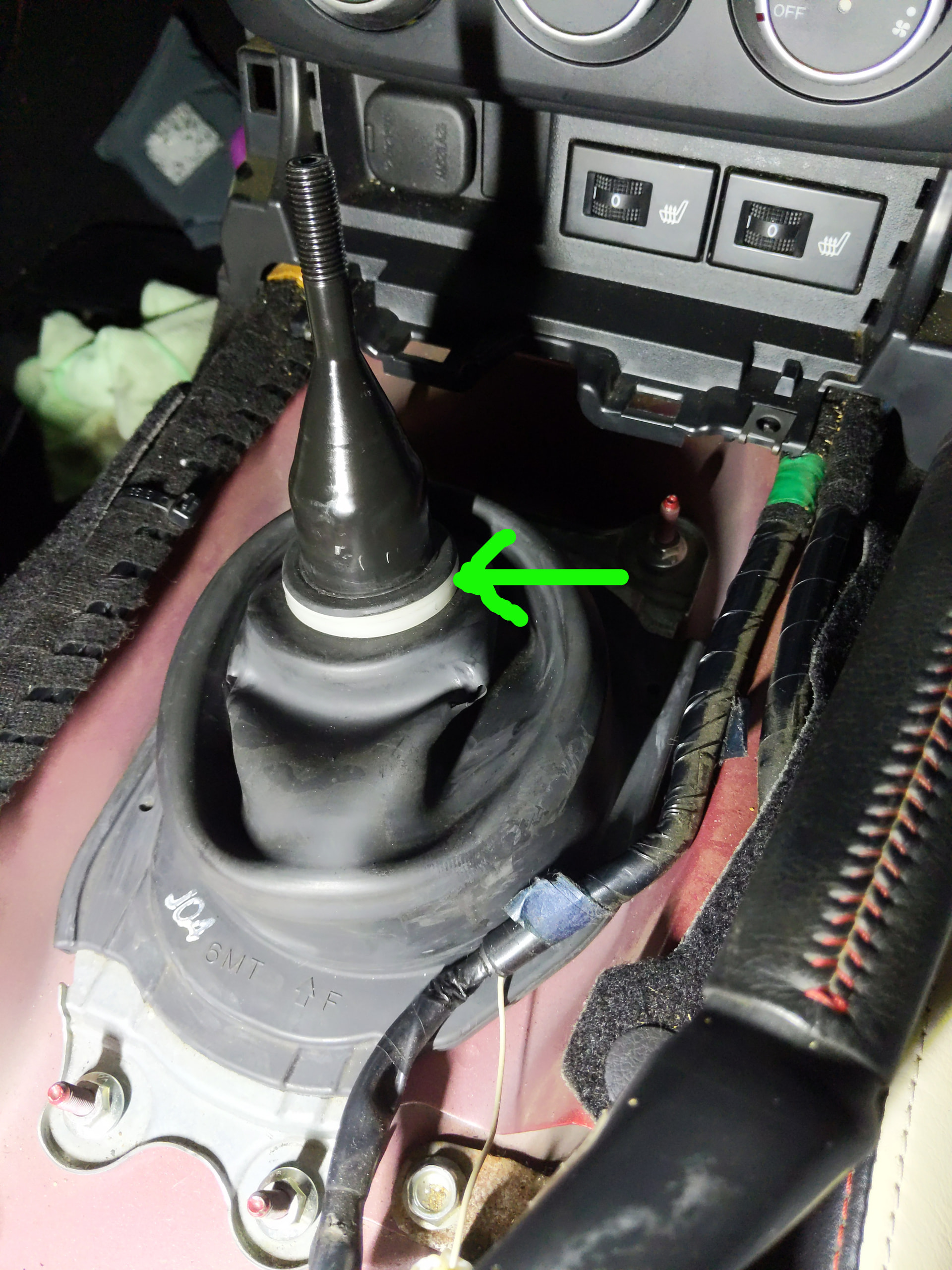 I had some oil left from when my gearbox was last serviced, (Red Line MT-90 GL-4) so I just used that. It took about 150-200ML; I didn’t measure, I just poured it in until it was level with the top of the selector cup (where the green arrow points to); any more than that and the ball pivot will be in the oil, which isn’t necessary since the Lithium grease will lube that bit.