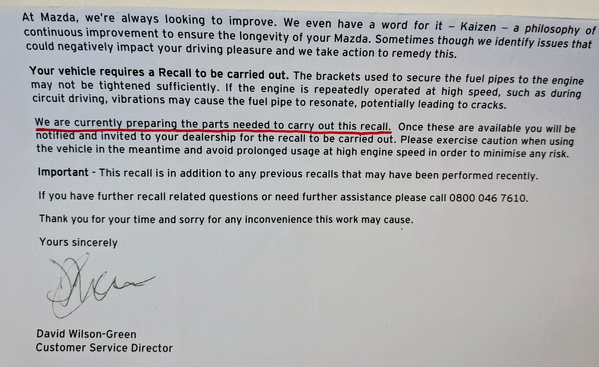 What a way to run a recall! The letter doesn’t say that at all, it says owners will be notified once parts are available…
